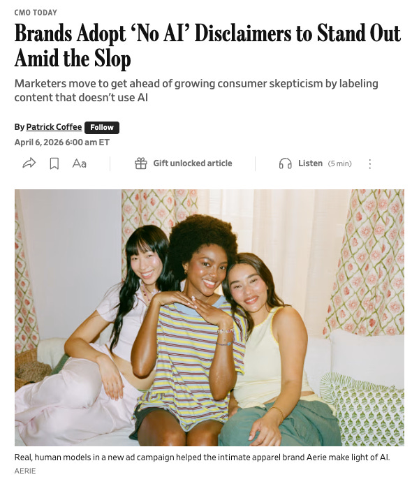 Brands are now running “No AI” disclaimers as a competitive advantage. Aerie recently promised consumers in a national campaign: “We commit: No AI generated bodies or people.”