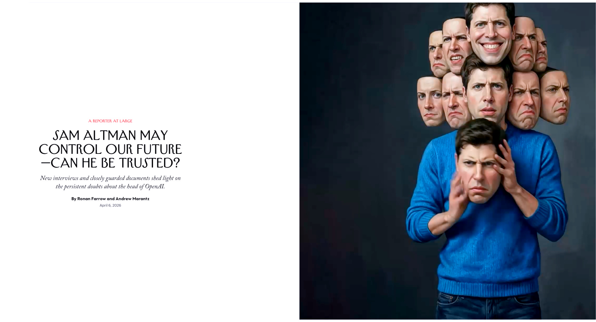 In one, Ronan Farrow and Andrew Marantz published a massive 17,000 word New Yorker investigation based on internal documents never previously disclosed. The subject was Sam Altman, CEO of OpenAI — the company behind ChatGPT, which now is the go-to for nearly a billion people around the world who use it to seek information, interpret events, and understand the world.